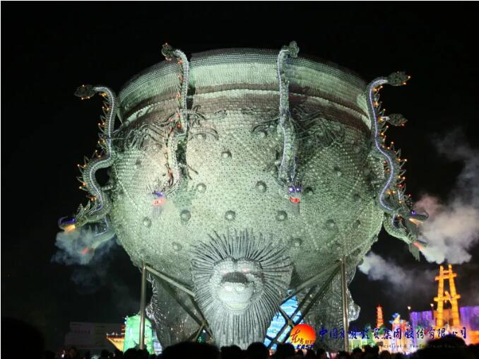 東方彩燈精心設(shè)計(jì)制作的“九龍鼎”燈組采用景德鎮(zhèn)青花玲瓏瓷具杯、羹、匙、盅、盤、碟、碗等近30萬(wàn)件手工捆扎而成,主體為鋼結(jié)構(gòu);鼎高和直徑均為18米,最大處直徑26米,總重近100噸。