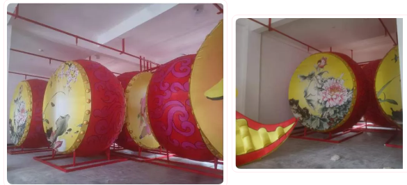 現(xiàn)場大多數(shù)的花燈還在按流程趕制中,也有一些已成型了。已經(jīng)制作好的打鼓你能看出是哪一個花燈造型的嗎?